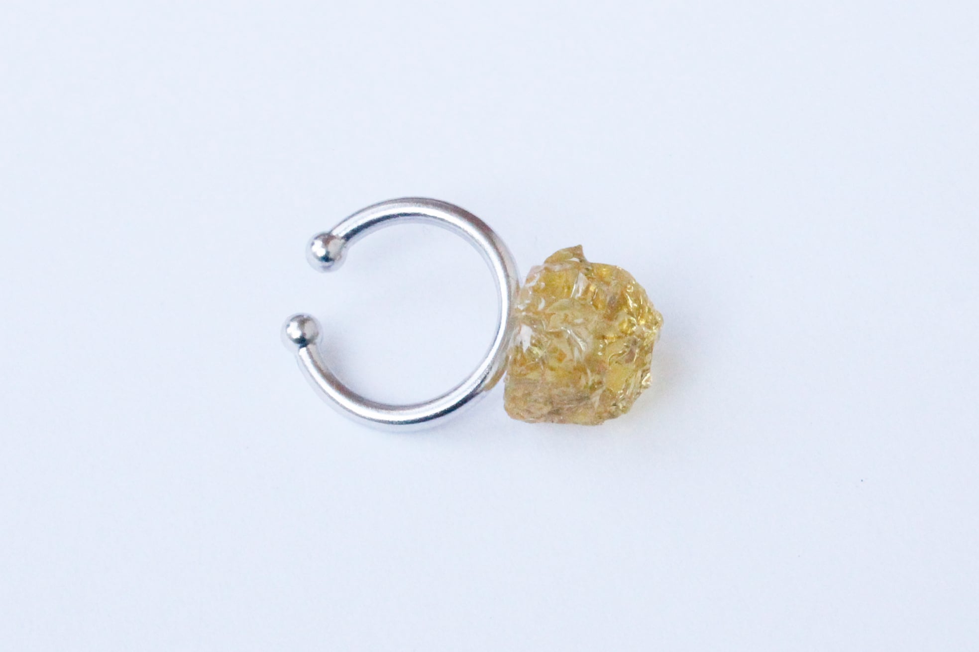 割れたガラスを使用したデザイン。その偶発性から生まれたそれぞれの形は唯一無二の独特の美しさを持ちます。割れたガラスを使用しデザイナーがジュエリーとして再構築する手順から「再生・生まれ変わり」をテーマとしています。