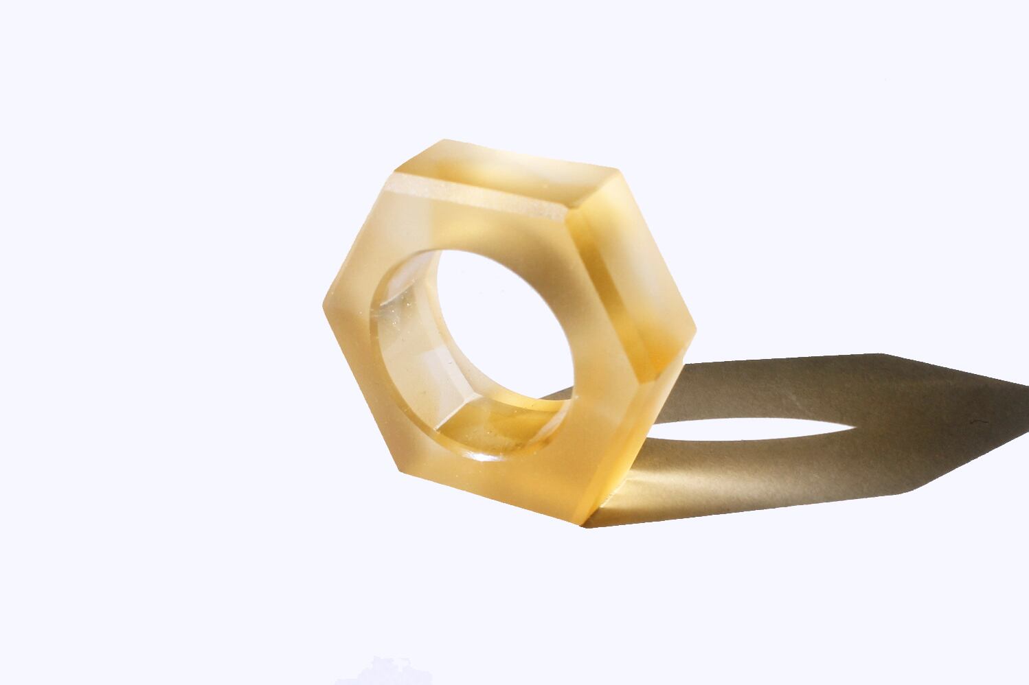 独特の多角形の形状と自立する特性が特徴です。このリングは身につけるだけでなく、オブジェとして飾っても美しく、ガラスの透明感や輝きが周囲の光を反射しながら、洗練された魅力を放ちます。リングが自立する姿には、「自分自身を見つめてみて、自分の内なる美しさや強さに気づくように」というテーマが込められています。そのため、身につける人を自信と喜びで満たし、自分自身を愛する感情を呼び起こすようにとデザインされたシリーズです。